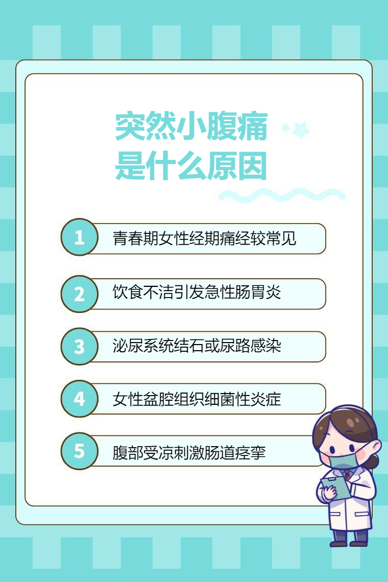 突然小腹痛可能与经期痛经、急性肠胃炎、泌尿系统结石或感染、盆腔炎、肠道痉挛等因素有关。