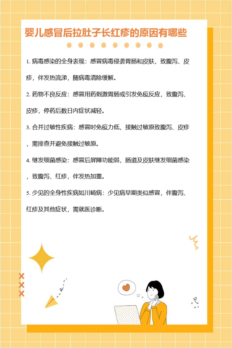 婴儿感冒后拉肚子长红疹的常见原因包括病毒感染的全身表现、药物不良反应、合并过敏性疾病、继发细菌感染、少见的全身性疾病如川崎病等。