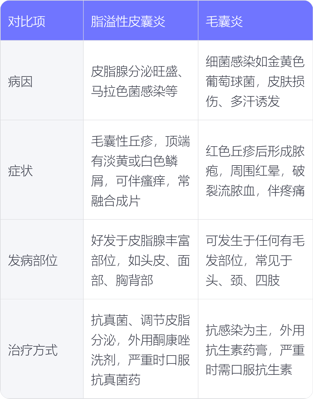 4. 治疗方式:脂溢性皮囊炎治疗以抗真菌、调节皮脂分泌为主,可外用抗真菌药物,如酮康唑洗剂,严重时口服抗真菌药;毛囊炎治疗以抗感染为主,轻度可外用抗生素药膏,如莫匹罗星软膏,严重时需口服抗生素。