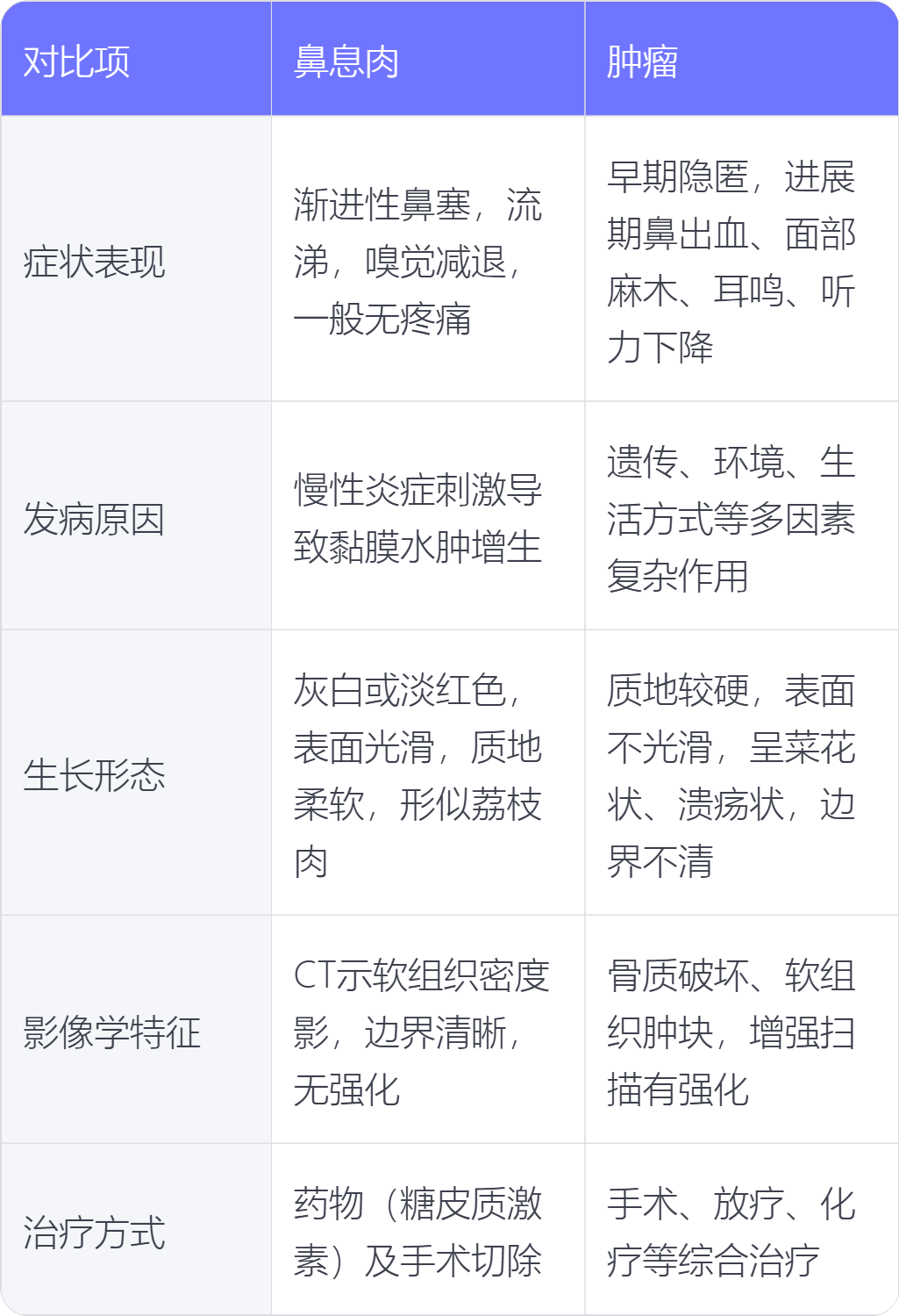 鼻息肉和肿瘤可从症状表现、发病原因、生长形态、影像学特征、治疗方式来区分。