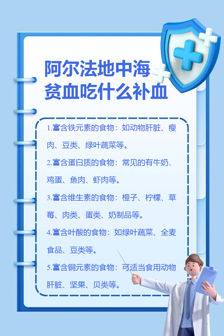阿尔法地中海贫血可通过食用富含铁元素、蛋白质、维生素、叶酸、铜元素的食物等补血。