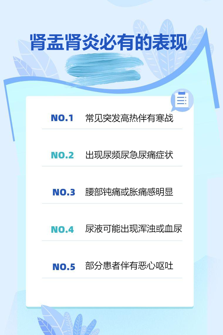 肾盂肾炎必有的表现包括发热、尿频尿急尿痛、腰痛、尿液性状改变、恶心呕吐等。