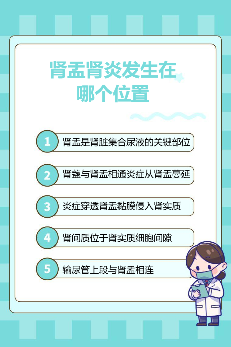 肾盂肾炎的发生位置主要包括肾盂、肾盏、肾实质、肾间质、输尿管上段等。