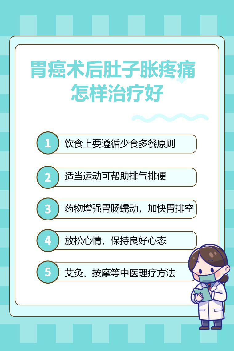 胃癌术后肚子胀疼痛可通过调整饮食、适当运动、药物治疗、心理调节、中医理疗等方式治疗好。