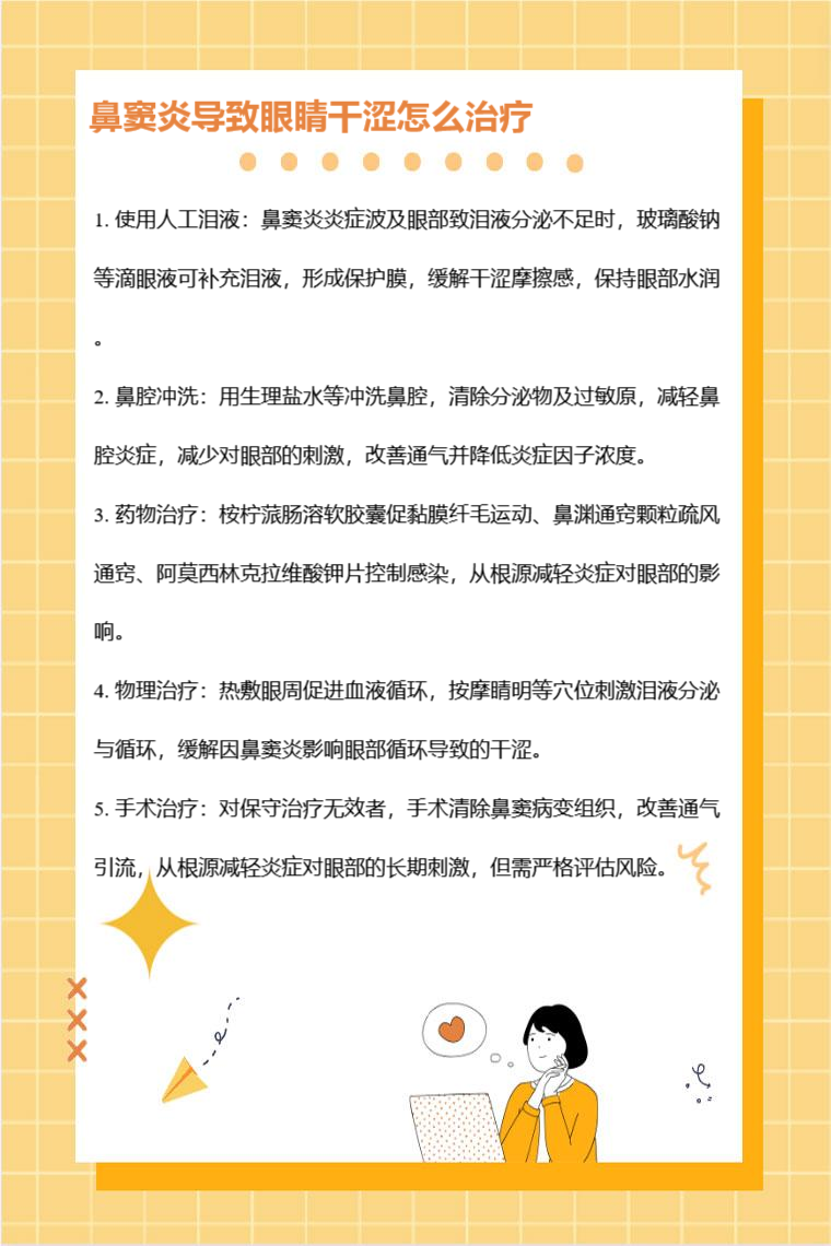 鼻窦炎导致眼睛干涩可通过使用人工泪液、鼻腔冲洗、药物治疗、物理治疗、手术治疗等方法来缓解。