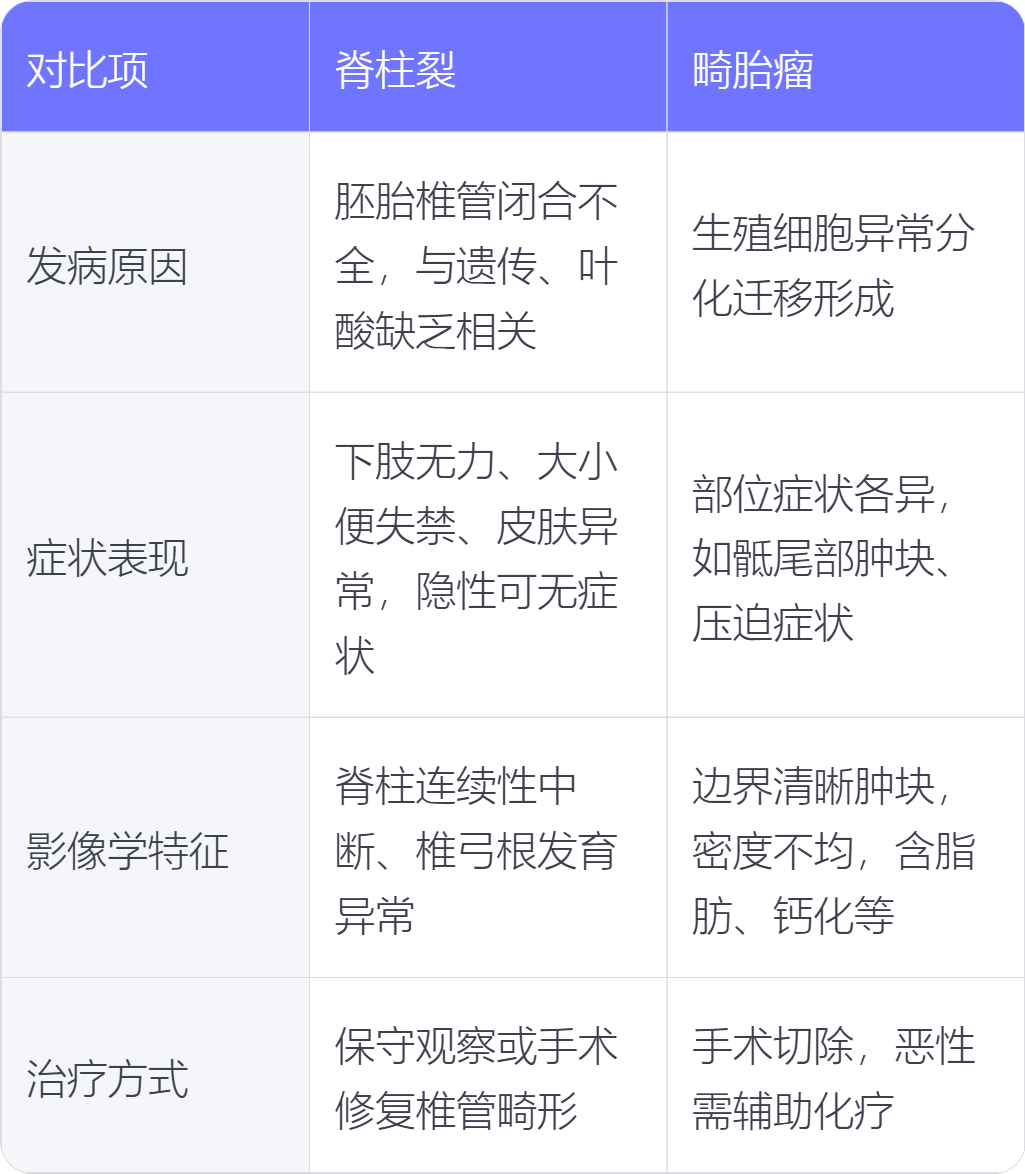脊柱裂和畸胎瘤可从发病原因、症状表现、影像学特征、治疗方式几方面来区分。