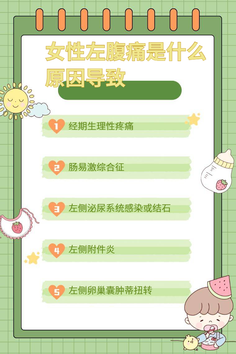 女性左腹痛可由经期生理性疼痛、肠易激综合征、左侧泌尿系统感染或结石、左侧附件炎、左侧卵巢囊肿蒂扭转等多种因素导致。