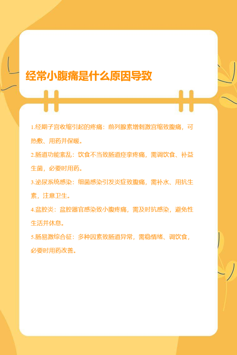 经常小腹痛可能由经期子宫收缩引起的疼痛、肠道功能紊乱导致的肠道痉挛、泌尿系统感染引发的下腹部不适、盆腔炎造成的盆腔区域疼痛、肠易激综合征带来的反复腹部隐痛等多种因素导致。