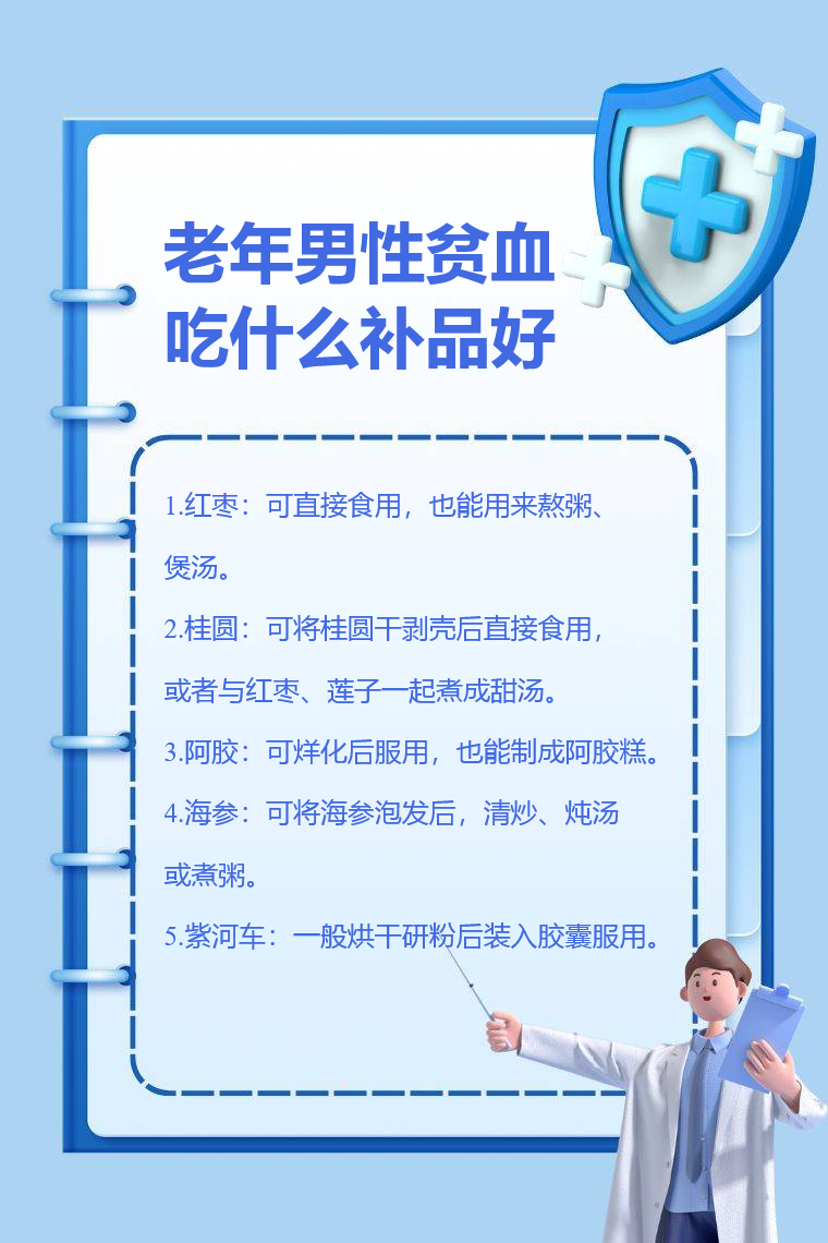 红枣、桂圆、阿胶、海参、紫河车等都是适合老年男性贫血时食用的补品。