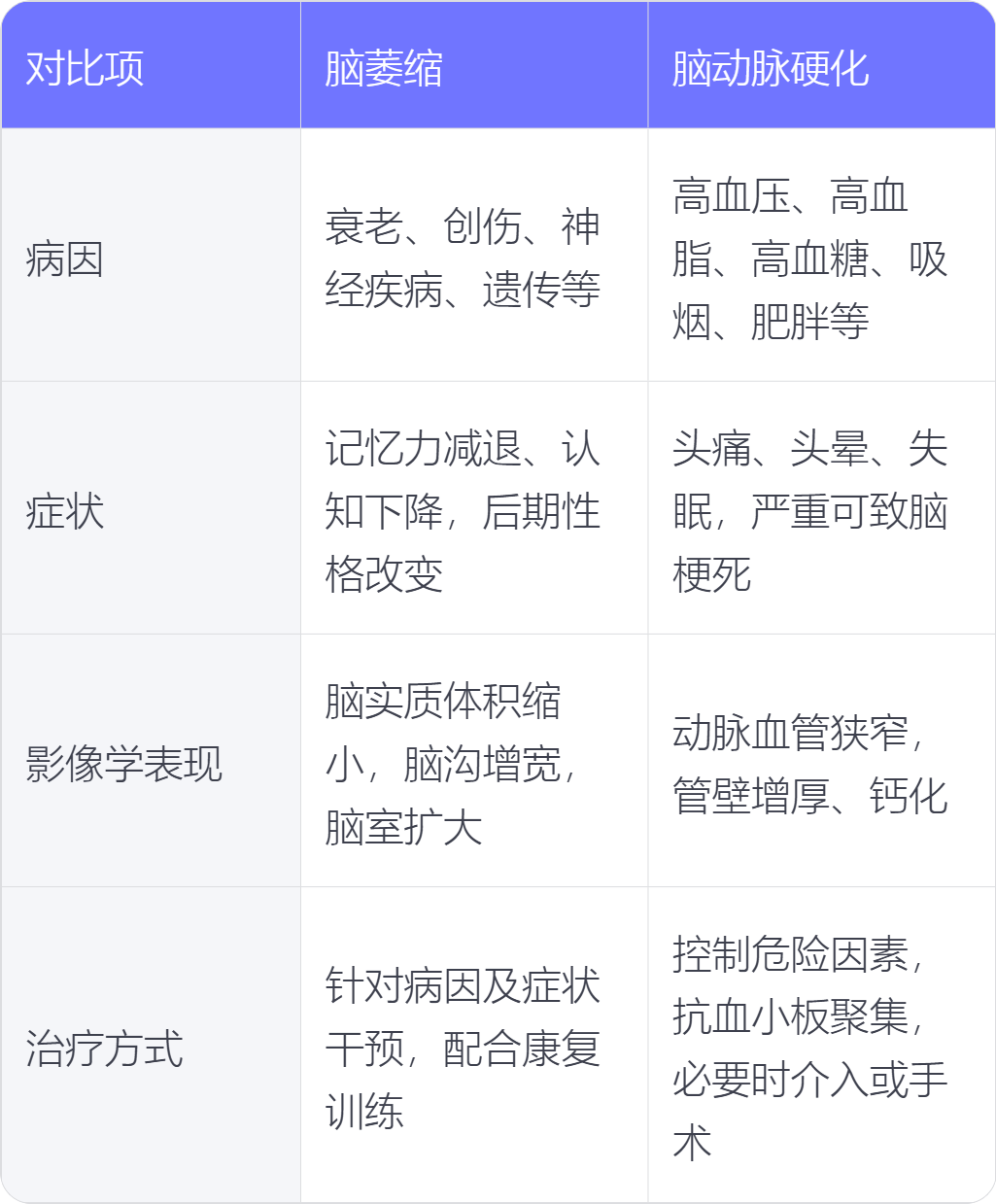 脑萎缩与脑动脉硬化在病因、症状、影像学表现、治疗方式上存在不同。