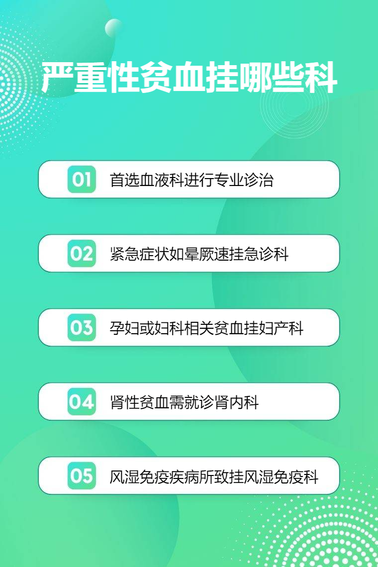 严重性贫血可挂血液科、急诊科、妇产科、肾内科、风湿免疫科等。