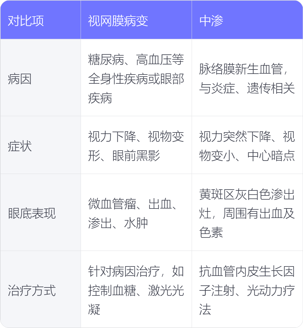 视网膜病变与中渗在病因、症状、眼底表现、治疗方式上不同。