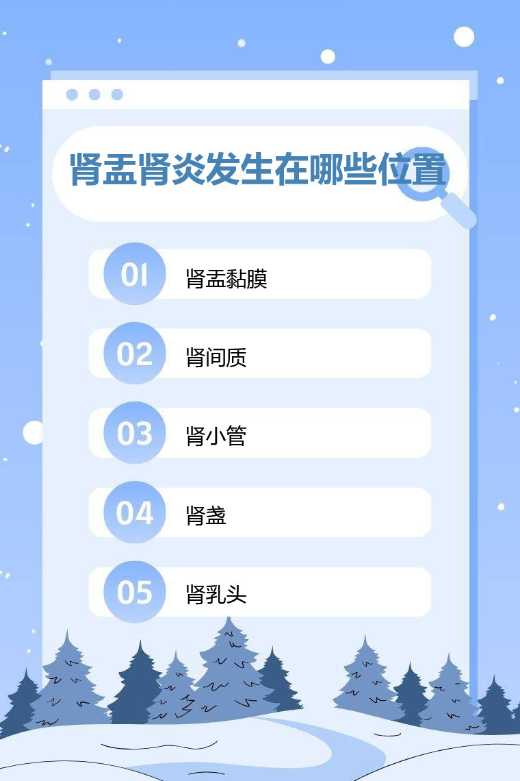 肾盂肾炎主要发生在肾盂黏膜、肾间质、肾小管、肾盏、肾乳头等位置。
