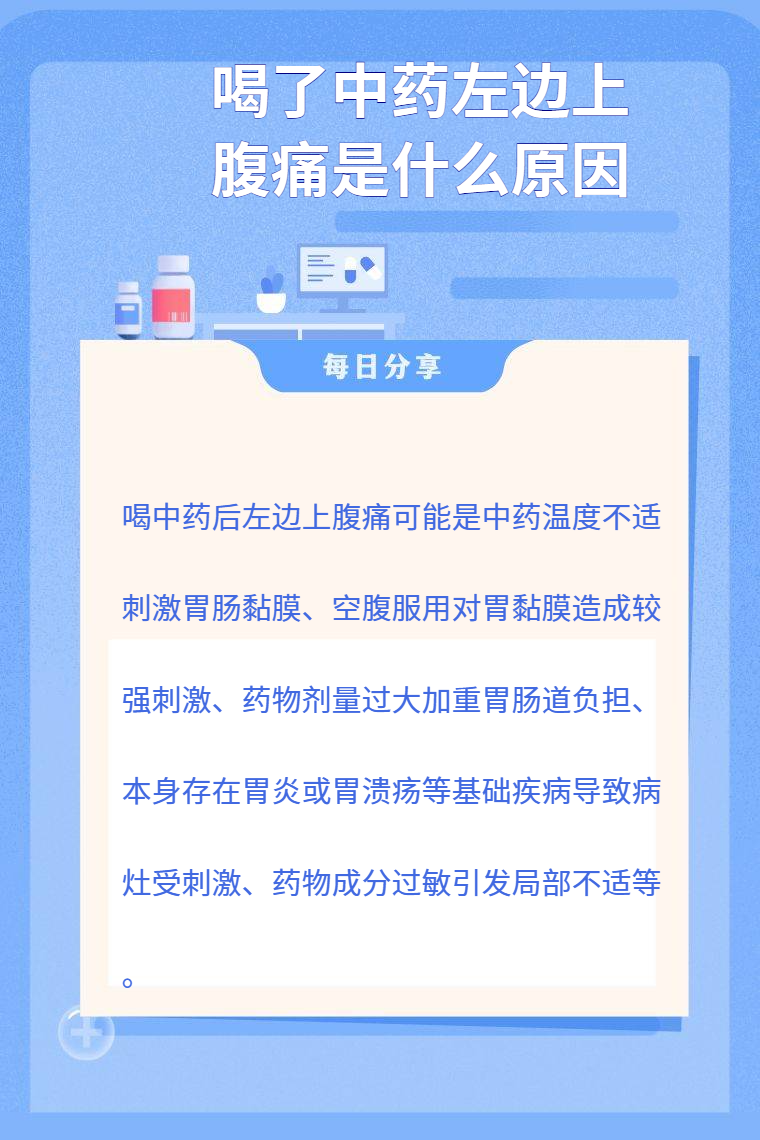 喝中药后左边上腹痛可能是中药温度不适刺激胃肠黏膜、空腹服用对胃黏膜造成较强刺激、药物剂量过大加重胃肠道负担、本身存在胃炎或胃溃疡等基础疾病导致病灶受刺激、药物成分过敏引发局部不适等。