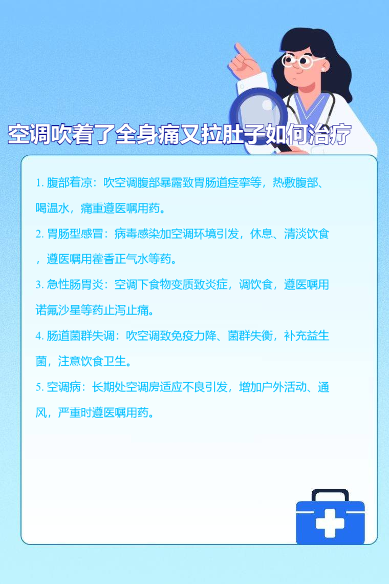 1. 腹部着凉:吹空调时腹部暴露在外,易导致着凉,引起胃肠道痉挛和全身肌肉应激反应,出现全身痛与拉肚子症状。可通过热敷腹部缓解,用热水袋或热毛巾敷于腹部,每次 15 - 20 分钟,同时多喝温热的开水,补充水分与温暖肠胃。若疼痛较严重,遵医嘱用药,如颠茄片、山莨菪碱片、复方枸橼酸阿尔维林软胶囊。