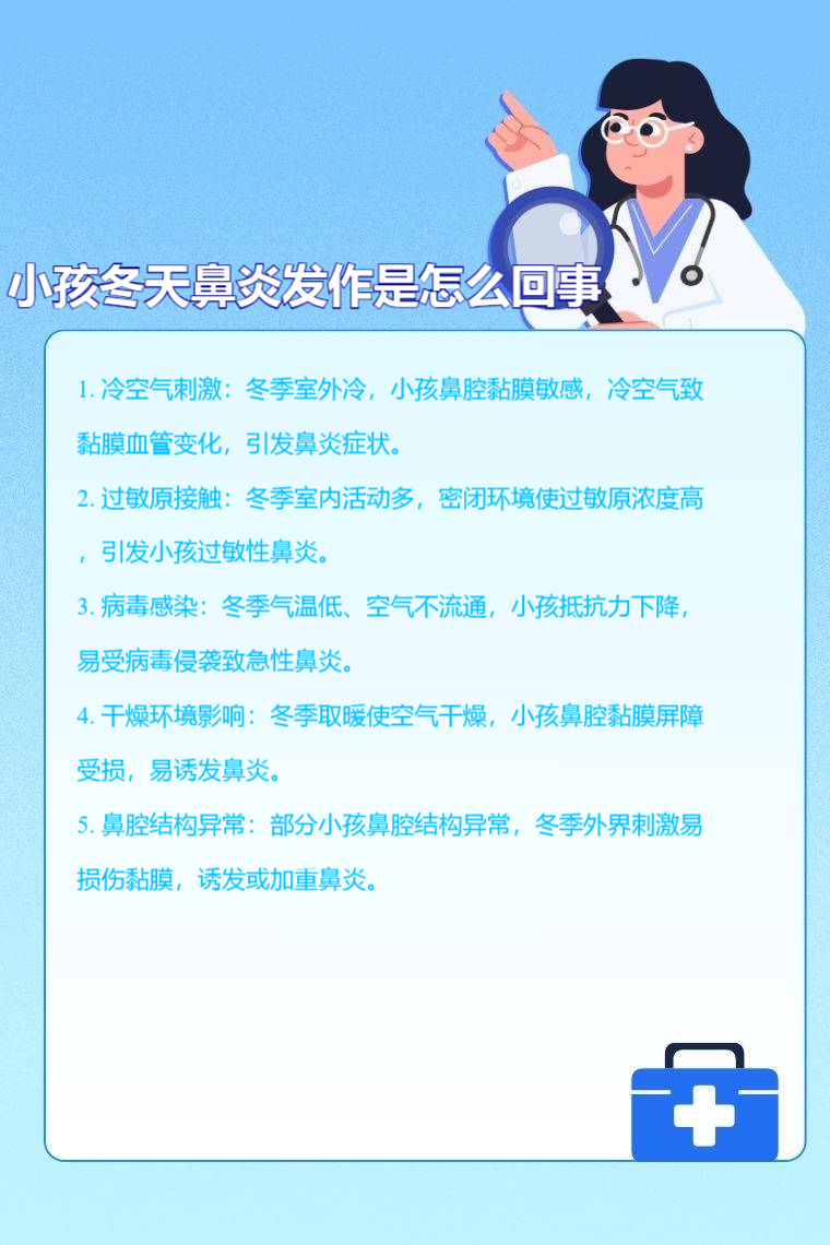 小孩冬天鼻炎发作常见原因包括冷空气刺激、过敏原接触、病毒感染、干燥环境影响、鼻腔结构异常等。