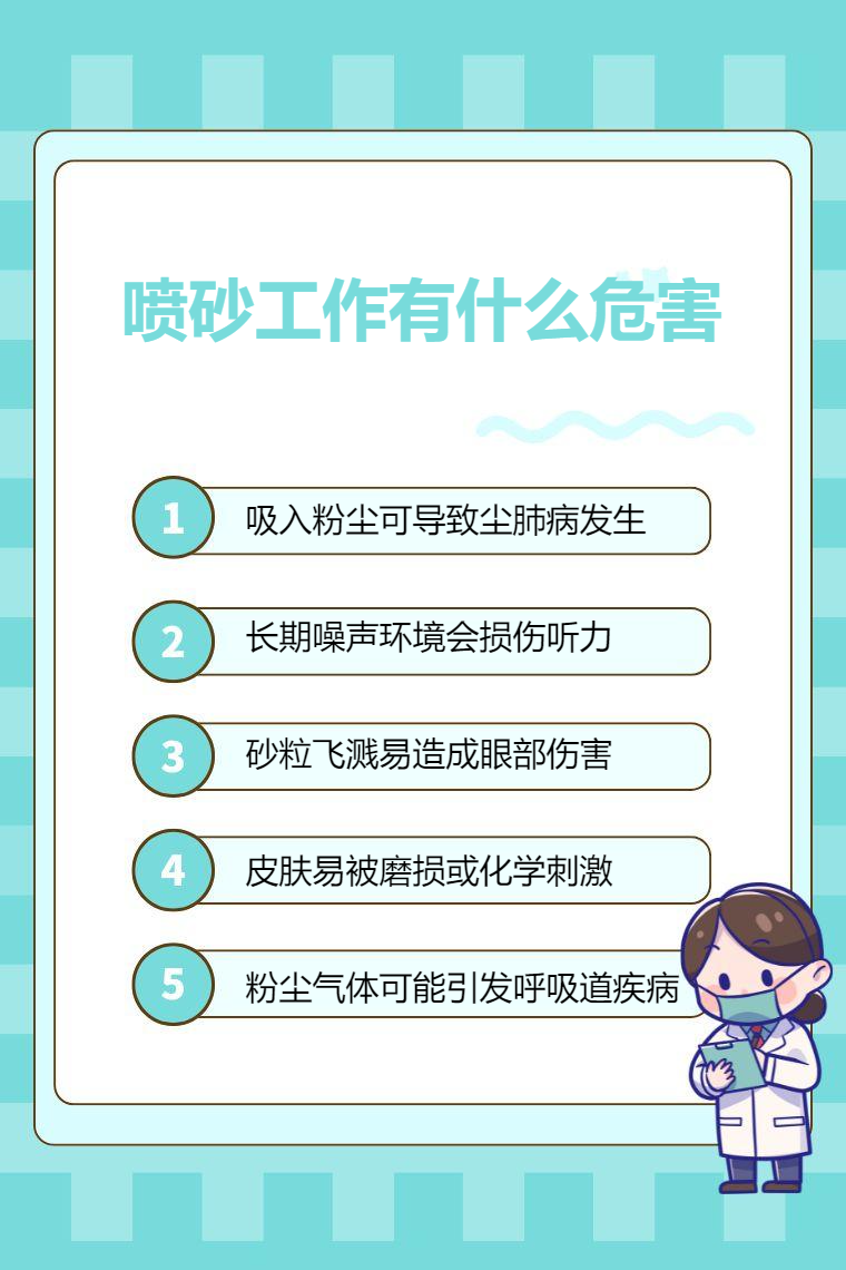 喷砂工作存在粉尘危害、噪声危害、眼部伤害、皮肤伤害、呼吸道疾病等危害。