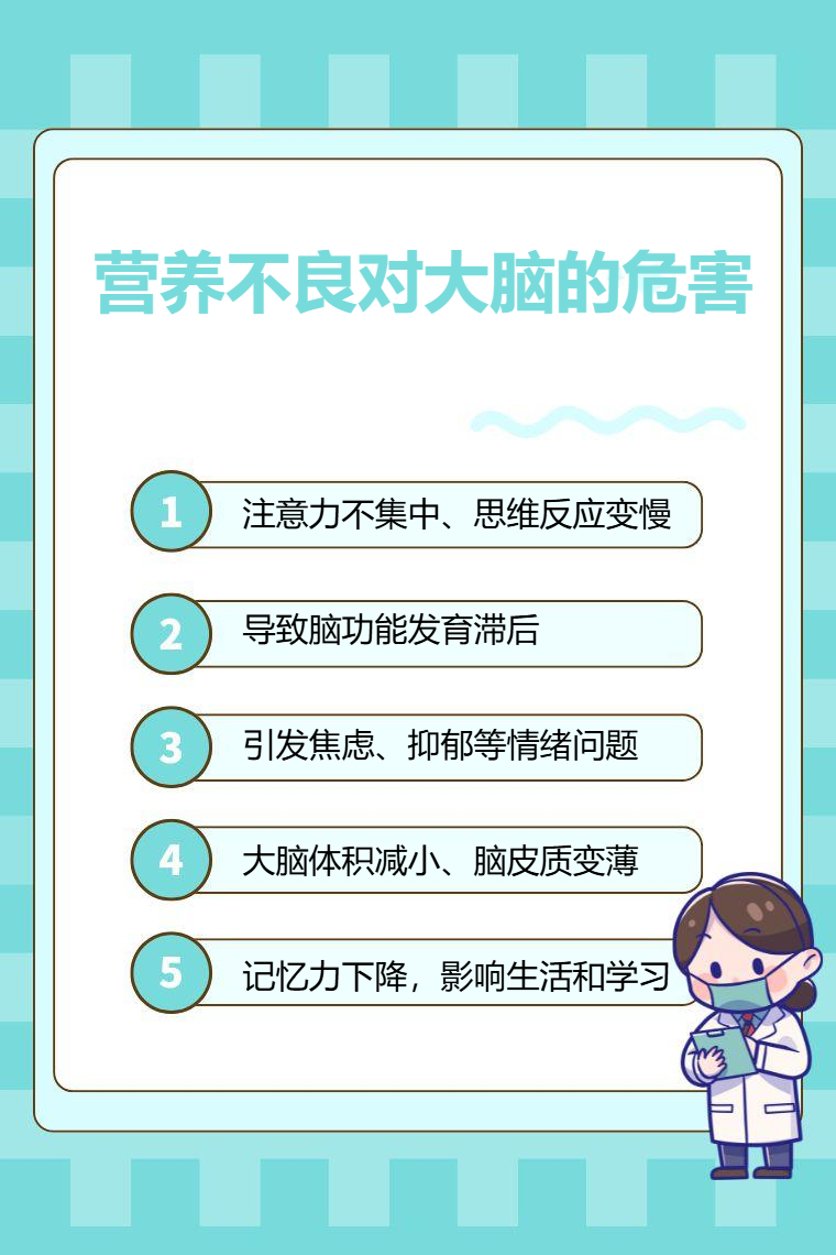 营养不良对大脑的危害包括认知能力下降、脑功能发育迟缓、神经递质失衡、大脑结构改变、记忆力减退等。