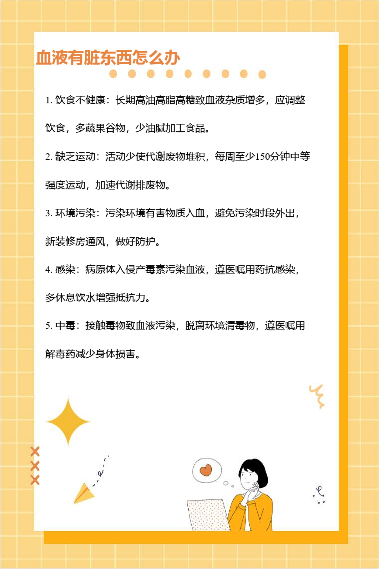 血液有脏东西可能是饮食不健康、缺乏运动、环境污染、感染、中毒等因素,需要针对病因治疗,可采取的方法有调整饮食、加强锻炼、改善环境、抗感染、解毒等。