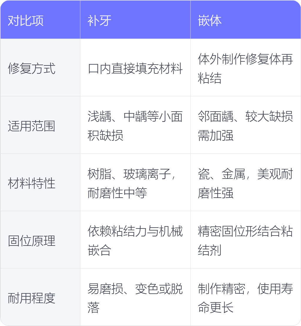1.修复方式:补牙是直接在口腔内对龋洞进行清洁后填充树脂、玻璃离子等材料,嵌体则是先取牙模在体外制作瓷、金属或树脂修复体,再通过粘结剂固定到牙体缺损处。