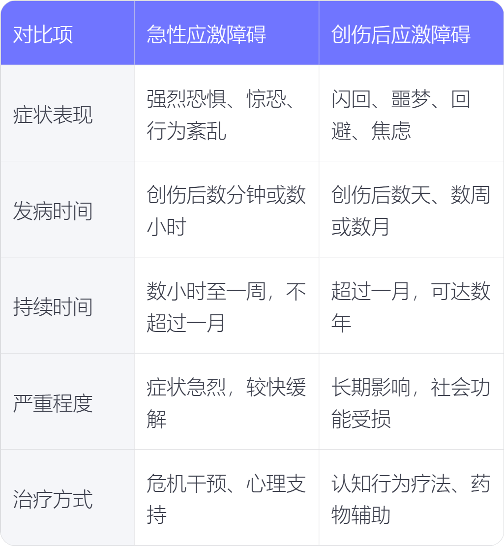2. 发病时间:急性应激障碍在创伤事件后数分钟或数小时内即可发病;创伤后应激障碍通常在创伤事件后数天、数周甚至数月后才出现症状。
