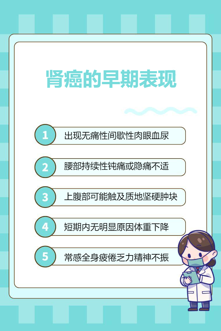 肾癌的早期表现包括血尿、腰痛、腹部肿块、体重异常下降、乏力等。