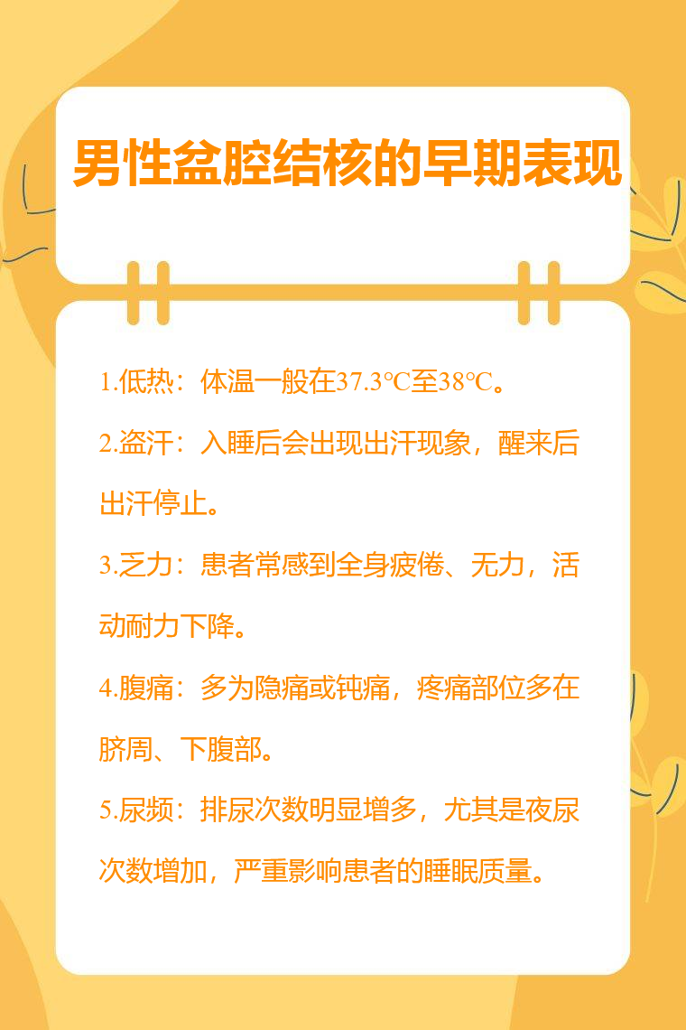 男性盆腔结核的早期表现有低热、盗汗、乏力、腹痛、尿频等。