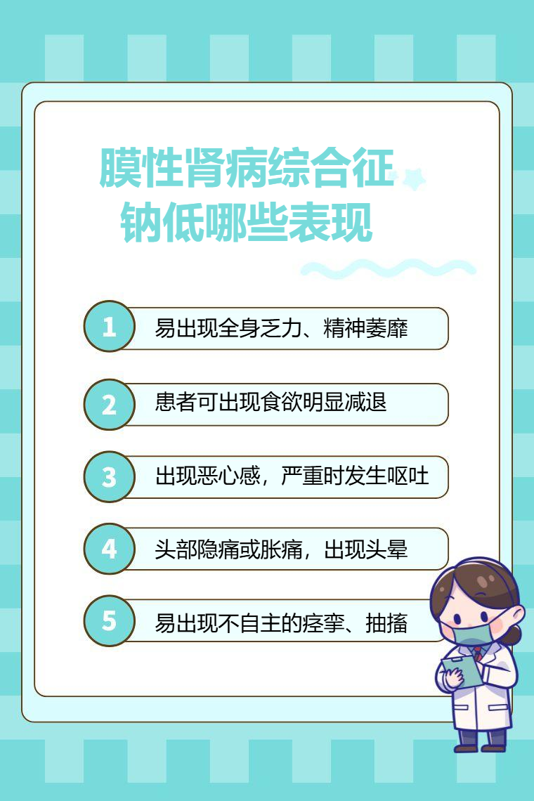 膜性肾病综合征患者出现钠低时,可表现为乏力疲倦、食欲减退、恶心呕吐、头痛头晕、肌肉痉挛抽搐等。