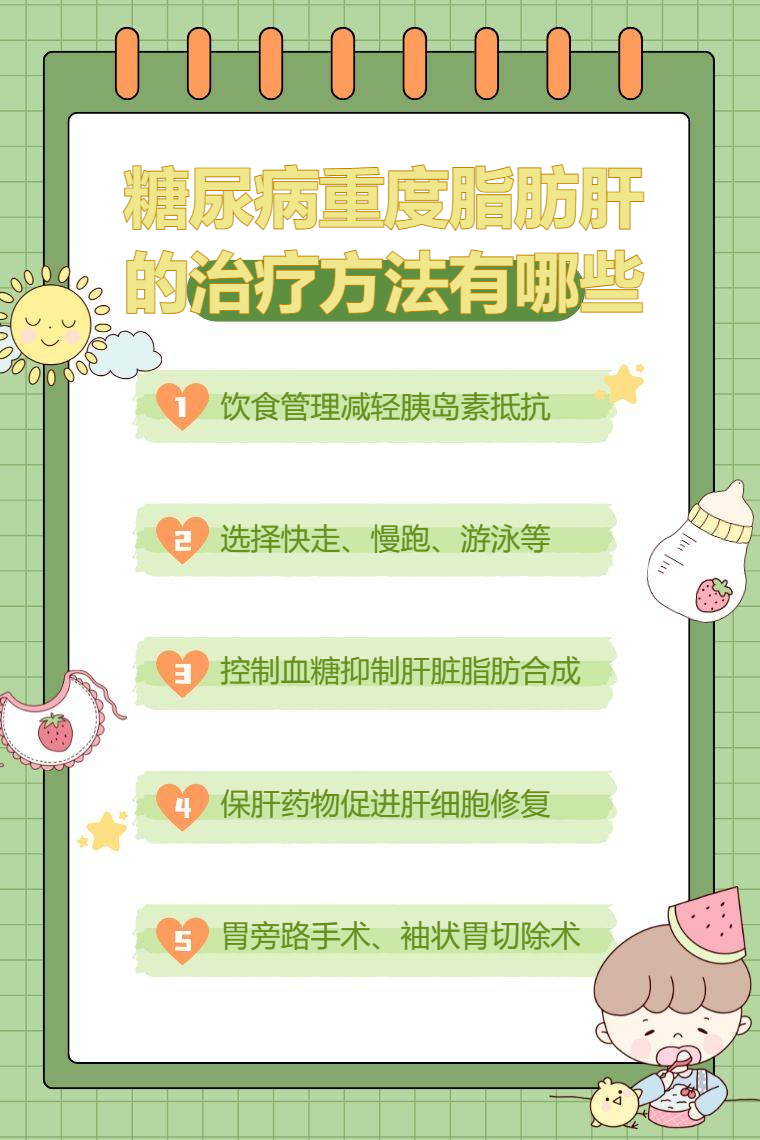 糖尿病重度脂肪肝的治疗方法包括饮食管理、规律运动、严格控制血糖、保肝药物治疗、代谢手术治疗等。