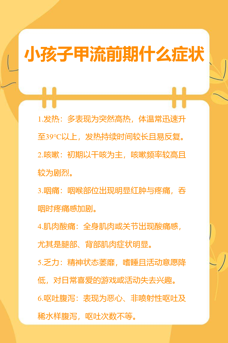 小孩子甲流前期常见症状包括发热、咳嗽、咽痛、肌肉酸痛、乏力、呕吐腹泻等。