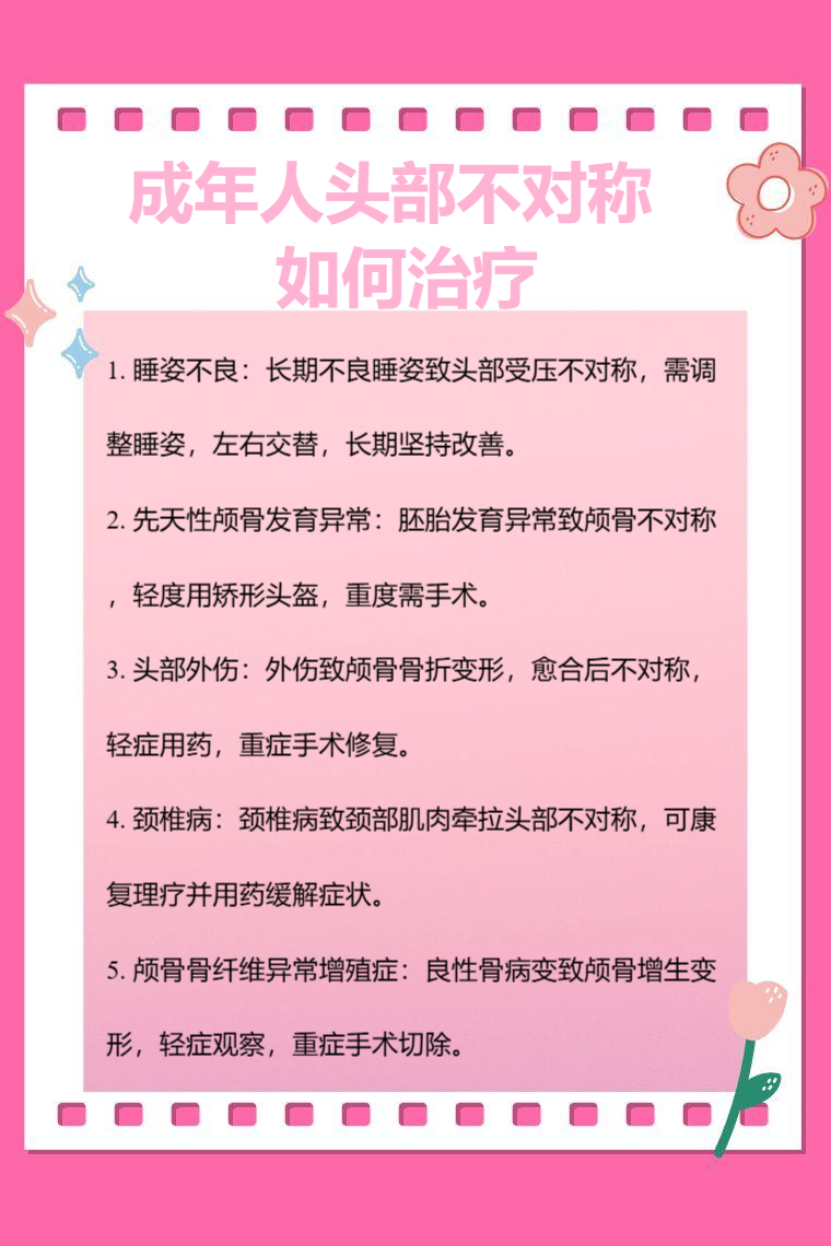成年人头部不对称可能是睡姿不良、先天性颅骨发育异常、头部外伤、颈椎病、颅骨骨纤维异常增殖症等因素,需要针对病因治疗,可采取的方法有调整生活习惯、手术治疗、康复治疗等。