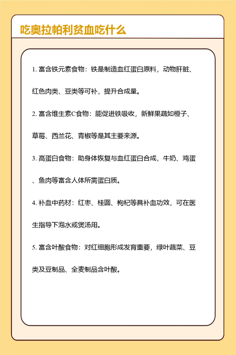 吃奥拉帕利出现贫血可通过食用富含铁元素食物、富含维生素C食物、高蛋白食物、补血中药材、富含叶酸食物等进行改善。
