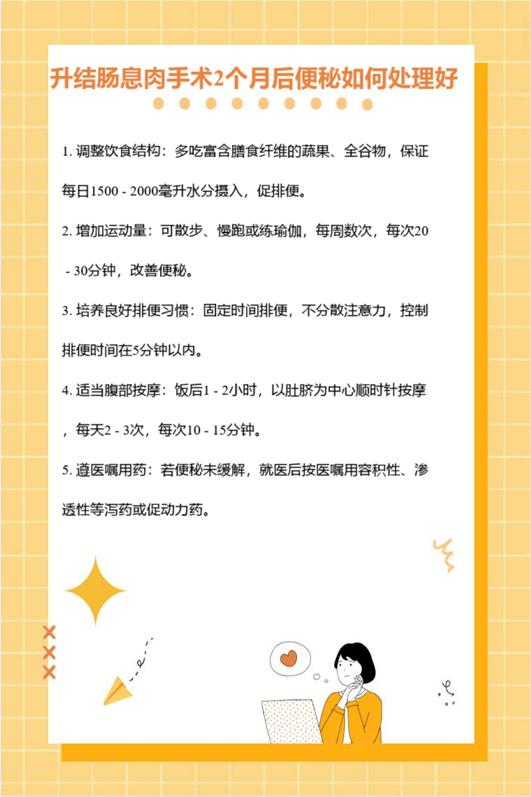 升结肠息肉手术 2 个月后便秘可以通过调整饮食结构、增加运动量、培养良好排便习惯、适当腹部按摩、遵医嘱用药等方式处理好。
