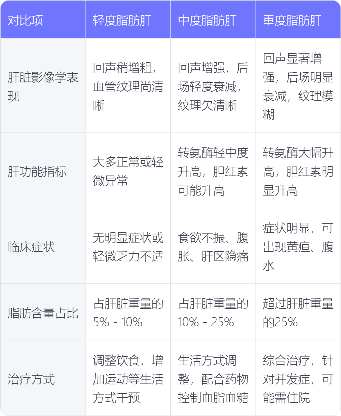 脂肪肝可通过肝脏影像学表现、肝功能指标、临床症状、脂肪含量占比、治疗方式来区别程度。