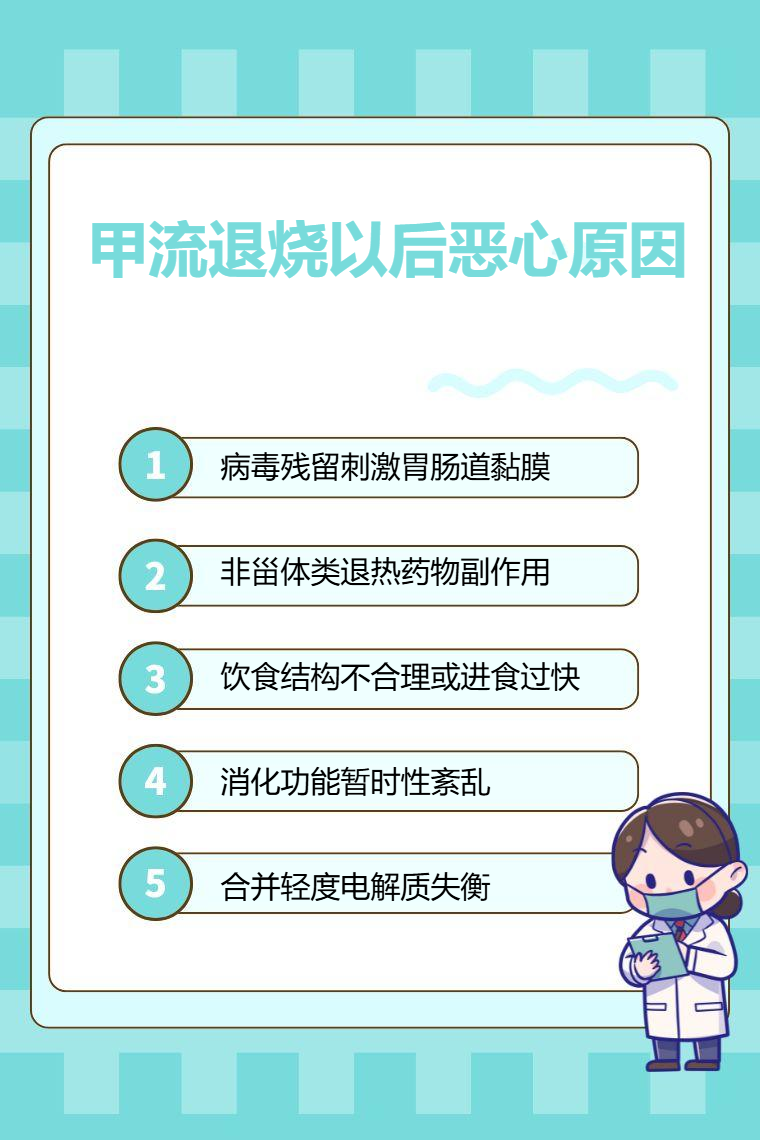 1.病毒残留刺激胃肠道黏膜:甲流病毒可侵袭消化道黏膜,退烧后体内仍有少量病毒残留,其成分会持续刺激胃肠黏膜,导致胃肠蠕动节律异常、胃酸分泌增多,进而引发恶心感,部分患者可能伴有轻微腹部不适或食欲下降。