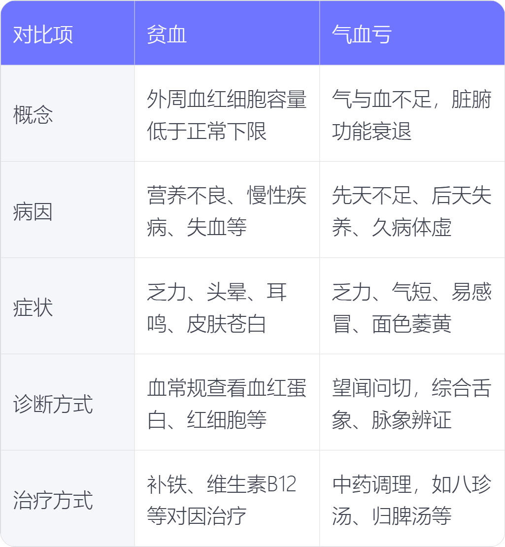 3. 症状:贫血主要表现为乏力、头晕、耳鸣、失眠、记忆力下降、皮肤苍白等;气血亏除了有类似乏力、头晕症状外,还会有气短、自汗、易感冒、面色萎黄或苍白、心悸等表现。