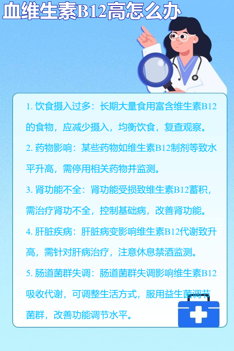 血维生素B12高可能是饮食摄入过多、药物影响、肾功能不全、肝脏疾病、肠道菌群失调等因素,需要针对病因治疗,可采取的方法有调整饮食、停用相关药物、治疗基础疾病等。