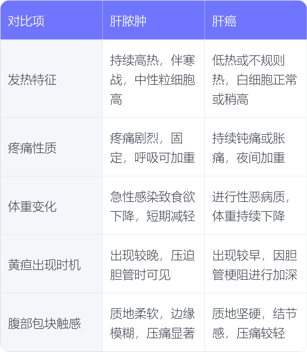 肝脓肿与肝癌在发热特征、疼痛性质、体重变化、黄疸出现时机、腹部包块触感五方面呈现不同临床面貌。