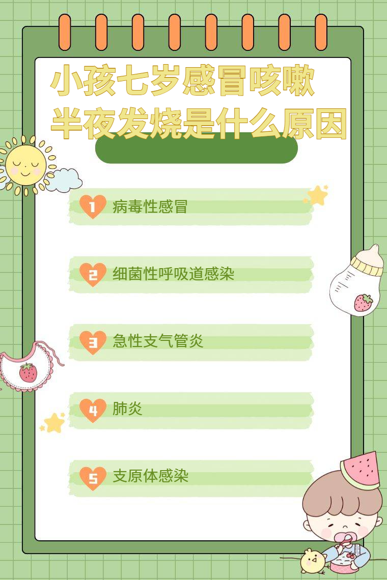 七岁小孩感冒咳嗽半夜发烧常见原因包括病毒性感冒、细菌性呼吸道感染、急性支气管炎、肺炎、支原体感染等。
