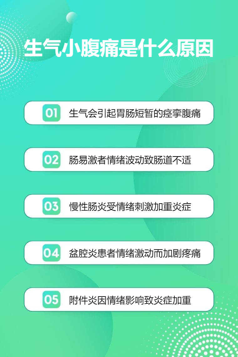 5.附件炎:附件组织慢性炎症,生气时机体应激反应导致炎症部位代谢加快、充血加重,出现腹痛,需保持心情舒畅,遵医嘱规范抗炎,定期复查附件情况。