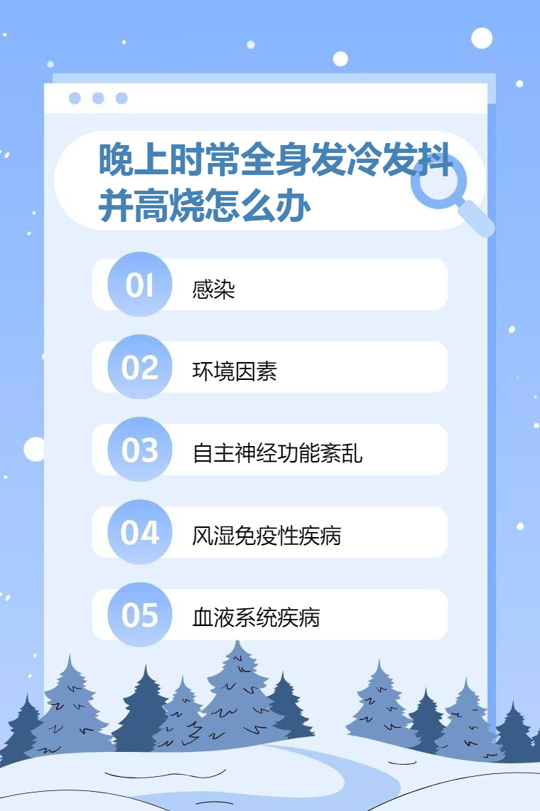 晚上时常全身发冷发抖并高烧可能是感染、环境因素、自主神经功能紊乱、风湿免疫性疾病、血液系统疾病等因素,需要针对病因治疗,可采取的方法有药物治疗、改善环境等。