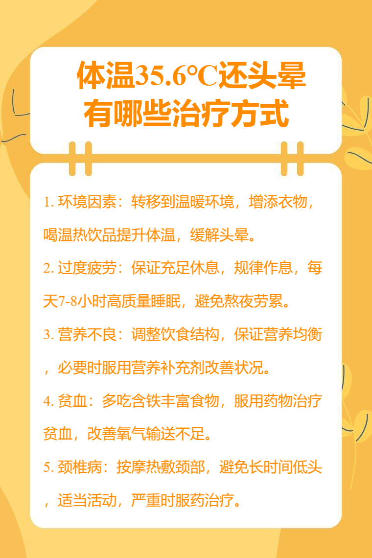 体温35.6℃还头晕可能是环境因素、过度疲劳、营养不良、贫血、颈椎病等因素,需要针对病因治疗,可采取的方法有改善环境、休息调整、补充营养、治疗贫血、缓解颈椎问题等。