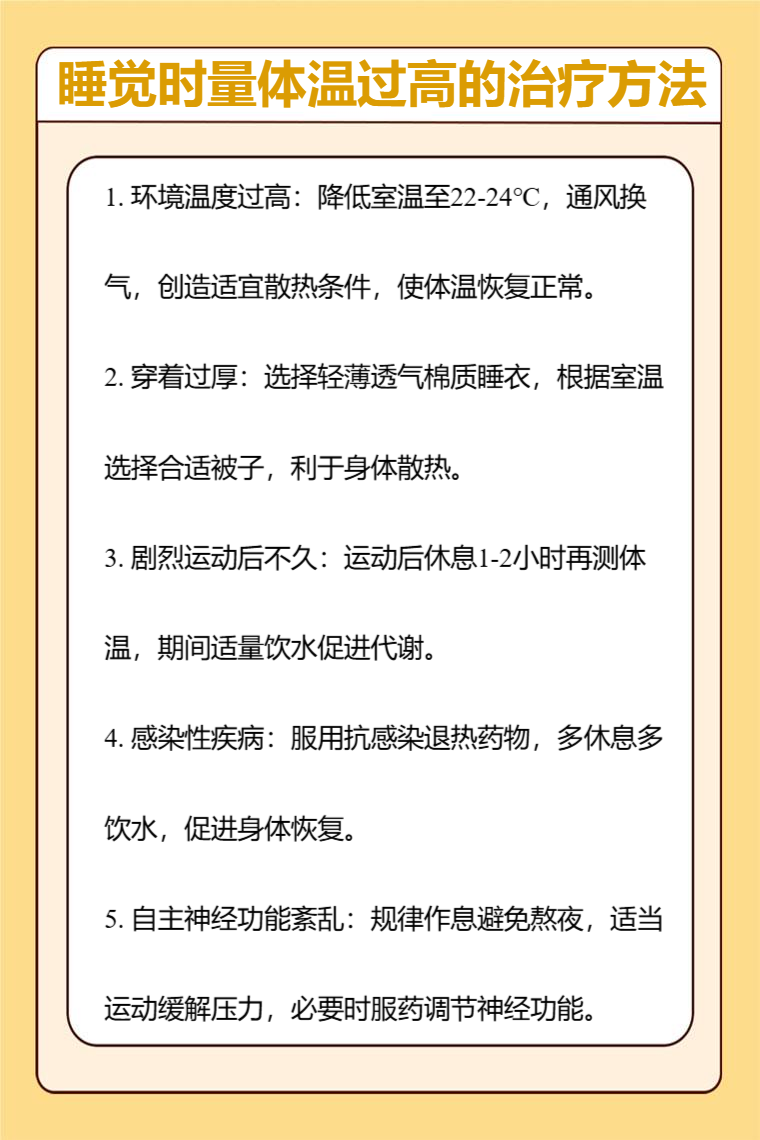 睡觉时量体温过高可能是环境温度过高、穿着过厚、剧烈运动后不久、感染性疾病、自主神经功能紊乱等因素,需要针对病因治疗,可采取的方法有改善环境、调整穿着、适当休息、药物治疗、调节生活方式等。