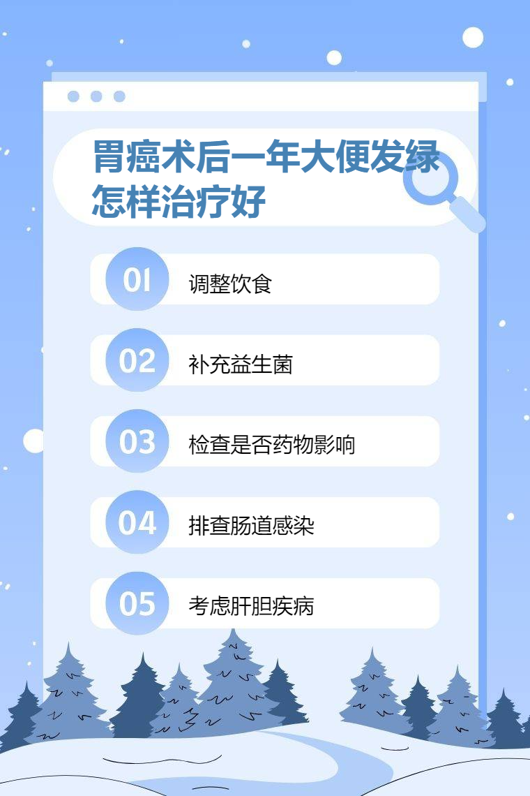 胃癌术后一年大便发绿可通过调整饮食、补充益生菌、检查是否药物影响、排查肠道感染、考虑肝胆疾病等方面治疗好。