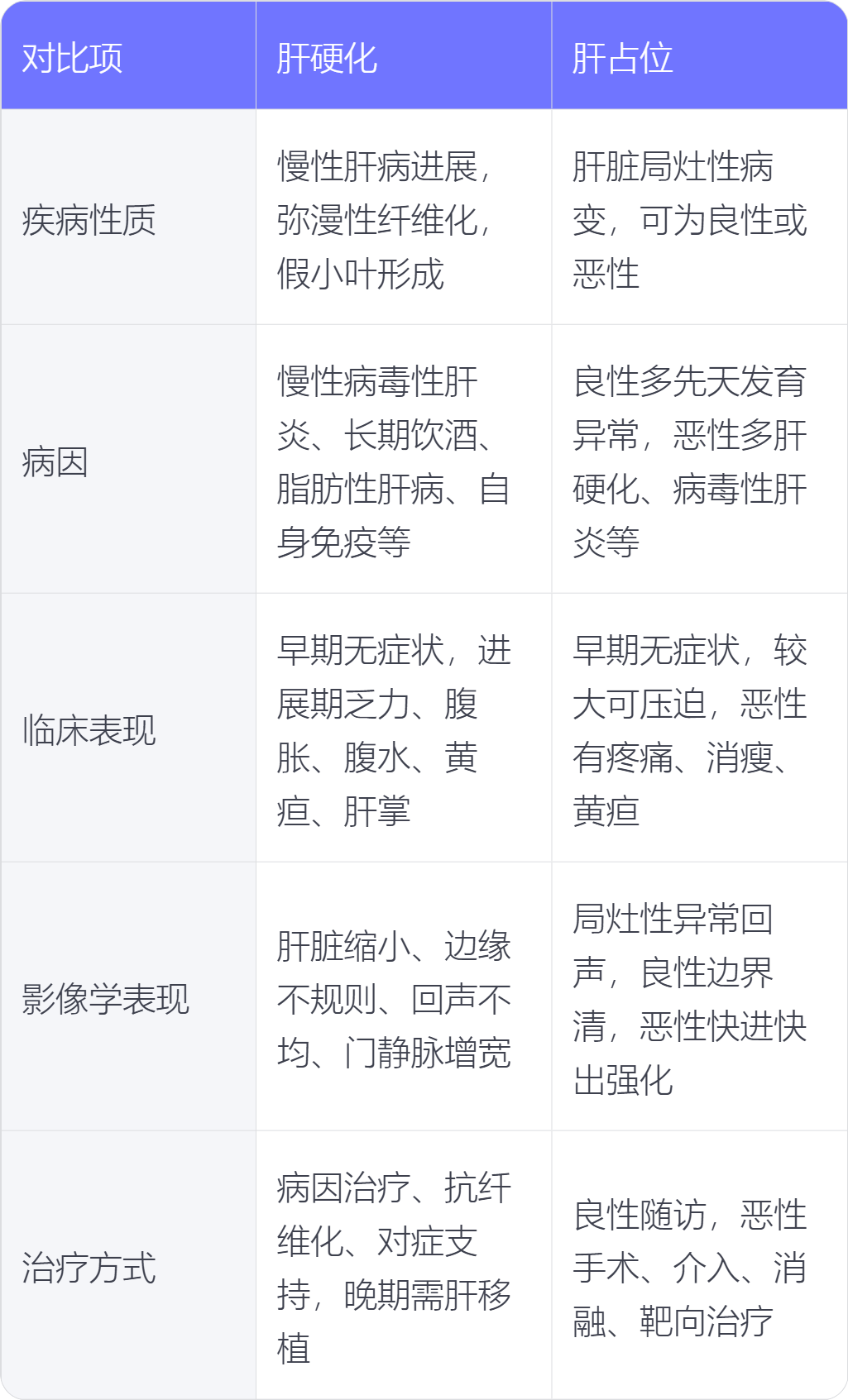 肝硬化和肝占位在疾病性质、病因、临床表现、影像学表现、治疗方式上存在不同。