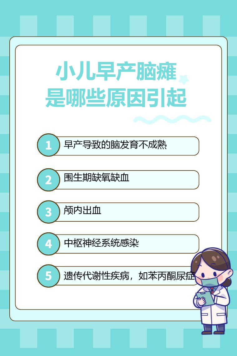 小儿早产脑瘫的原因主要包括早产导致的脑发育不成熟、围生期缺氧缺血、颅内出血、中枢神经系统感染、遗传代谢性疾病等。