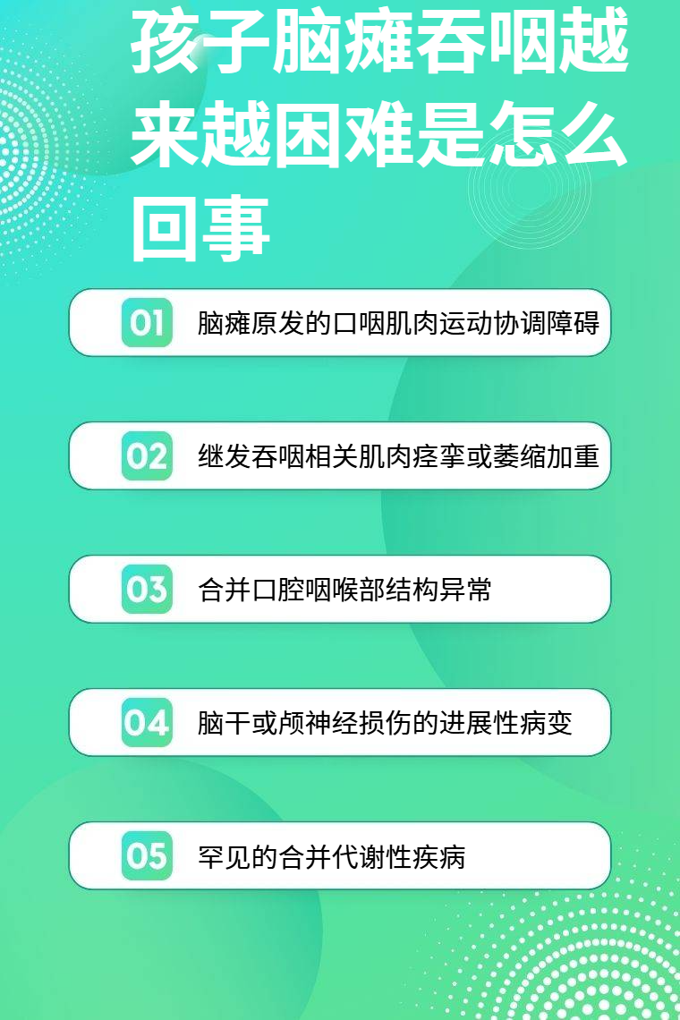 孩子脑瘫吞咽越来越困难常见原因包括脑瘫原发的口咽肌肉运动协调障碍、继发的吞咽相关肌肉痉挛或萎缩加重、合并口腔咽喉部结构异常、脑干或颅神经损伤的进展性病变、罕见的合并代谢性疾病等。