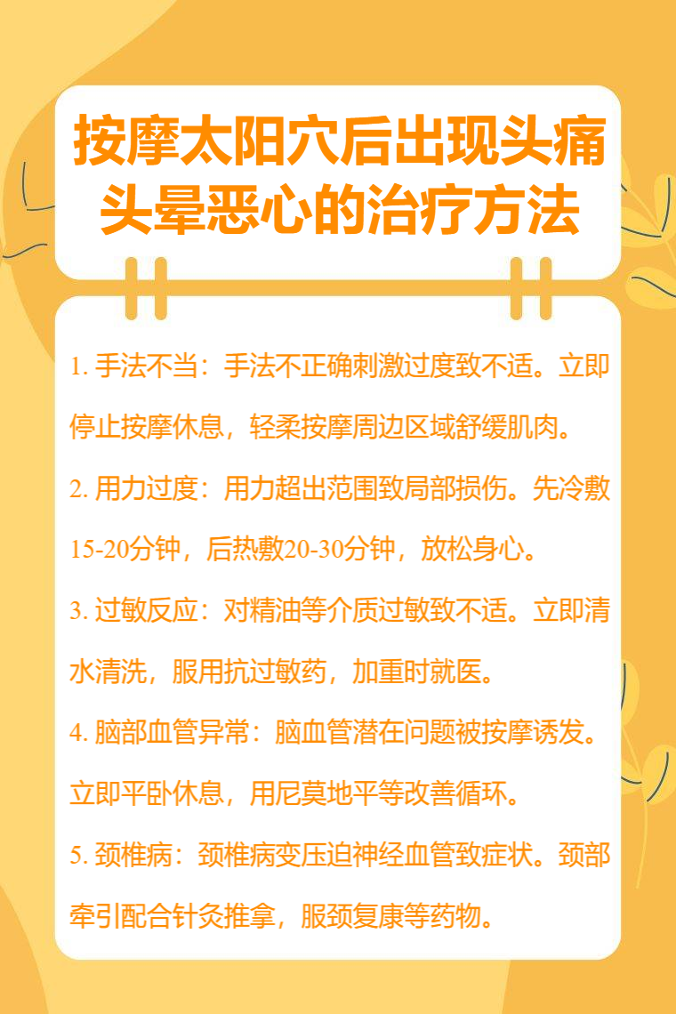 按摩太阳穴后出现头痛头晕恶心可能是手法不当、用力过度、过敏反应、脑部血管异常、颈椎病等因素,需要针对病因治疗,可采取的方法有调整手法、休息观察、药物治疗、物理治疗等。