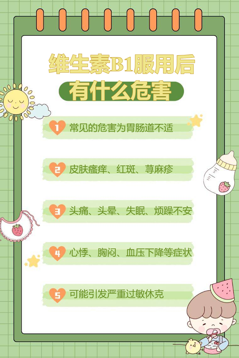 维生素B1服用后可能出现胃肠道不适、过敏反应、神经系统异常、心血管系统症状、严重过敏休克等危害。