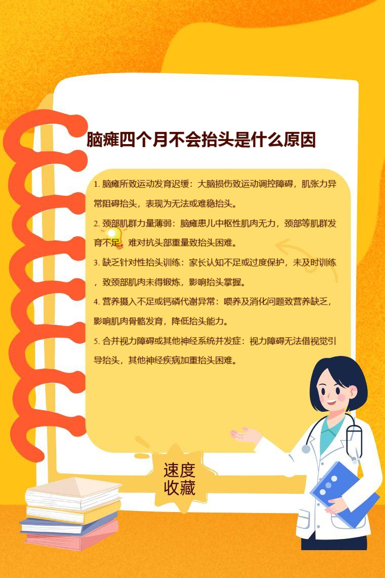 脑瘫四个月婴儿不会抬头的常见原因包括脑瘫所致运动发育迟缓、颈部肌群力量薄弱、缺乏针对性抬头训练、营养摄入不足或钙磷代谢异常、合并视力障碍或其他神经系统并发症等。